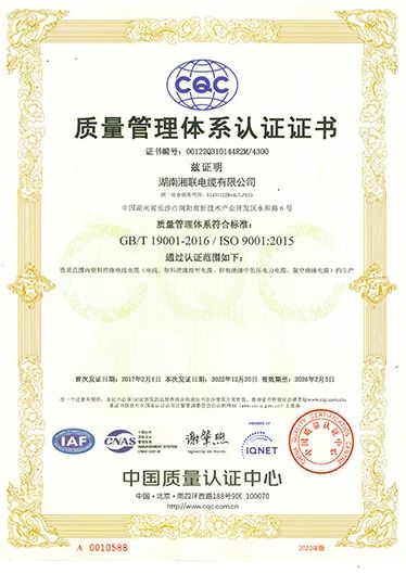 近年來(lái),湘聯(lián)電纜始終以“質(zhì)量是發(fā)展的基石,是客戶信任的唯一理由”的質(zhì)量方針為導(dǎo)向,逐步建立了高標(biāo)準(zhǔn)質(zhì)量管理體系。從采購(gòu)、生產(chǎn)、檢測(cè)等方面實(shí)施全方位質(zhì)量把控,落實(shí)各方面質(zhì)量責(zé)任,實(shí)現(xiàn)全過(guò)程質(zhì)量追溯。做到最大限度消除質(zhì)量隱患,產(chǎn)品質(zhì)量和客戶滿意度不斷提升。公司先后通過(guò)國(guó)家強(qiáng)制性產(chǎn)品認(rèn)證(CCC認(rèn)證)、全國(guó)工業(yè)生產(chǎn)許可證、“三位一體”管理體系、武器裝備質(zhì)量管理體系認(rèn)證,獲評(píng)專精特新小巨人企業(yè)、企業(yè)標(biāo)準(zhǔn)“領(lǐng)跑者”等榮譽(yù),得到業(yè)界廣泛認(rèn)可和贊譽(yù)。